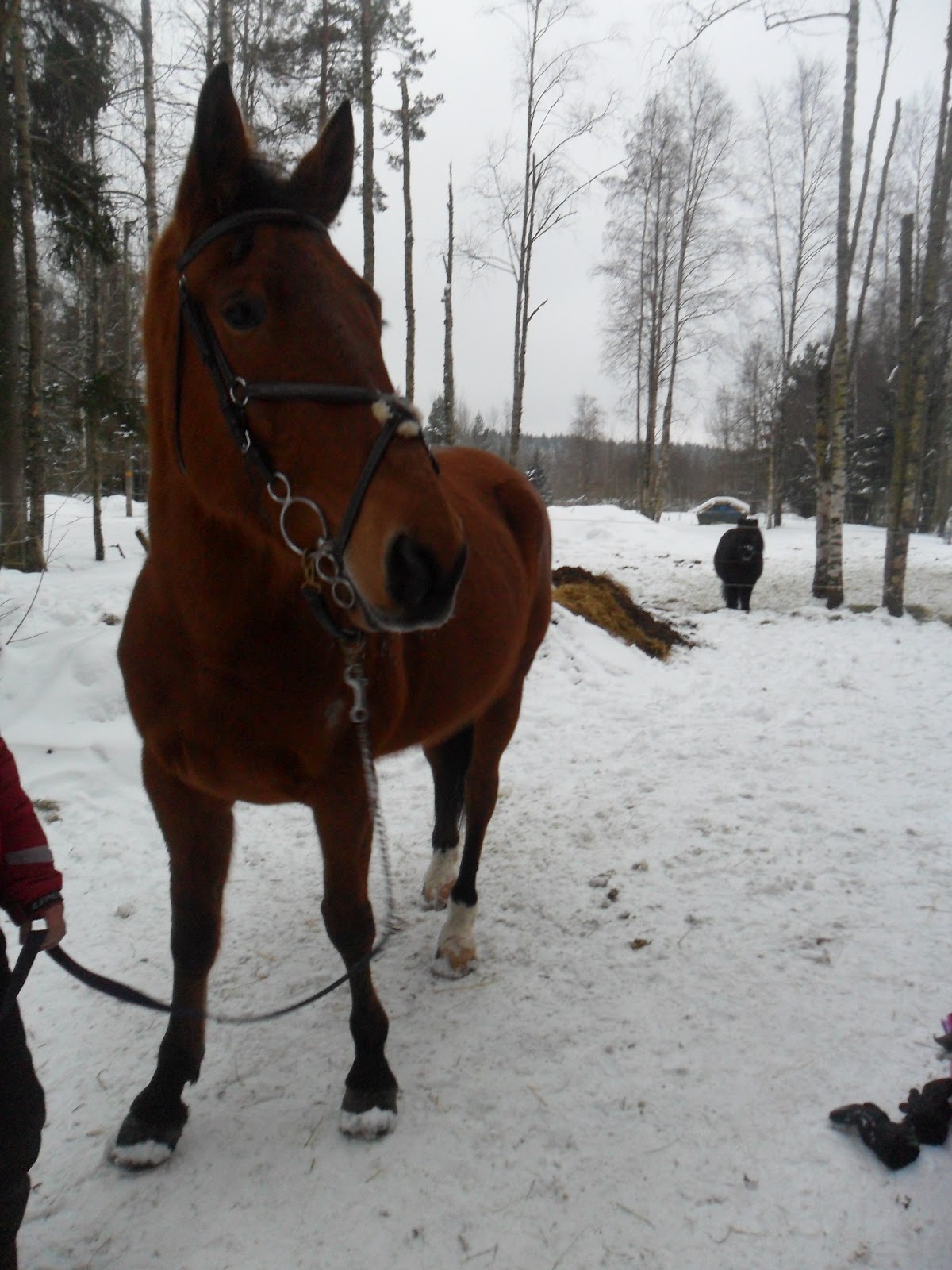 Maanantaina mentiin Janinan kanssa isäpuolemme kyydissä tallille, oli yllättävän kiva ilma, vain noin -6 astetta pakkasta, vihdoinkin leudompaa! Janina kävi hakemassa portilla odottelevan Fannin tarhasta. Neiti oli kuulemma mennyt ryminällä sunnuntai-aamuna ulos, kun oli saanut harjapakin säpäleiksi ja tallitoppis oli saanut komian rei'än josta pursui täytteet ulos.